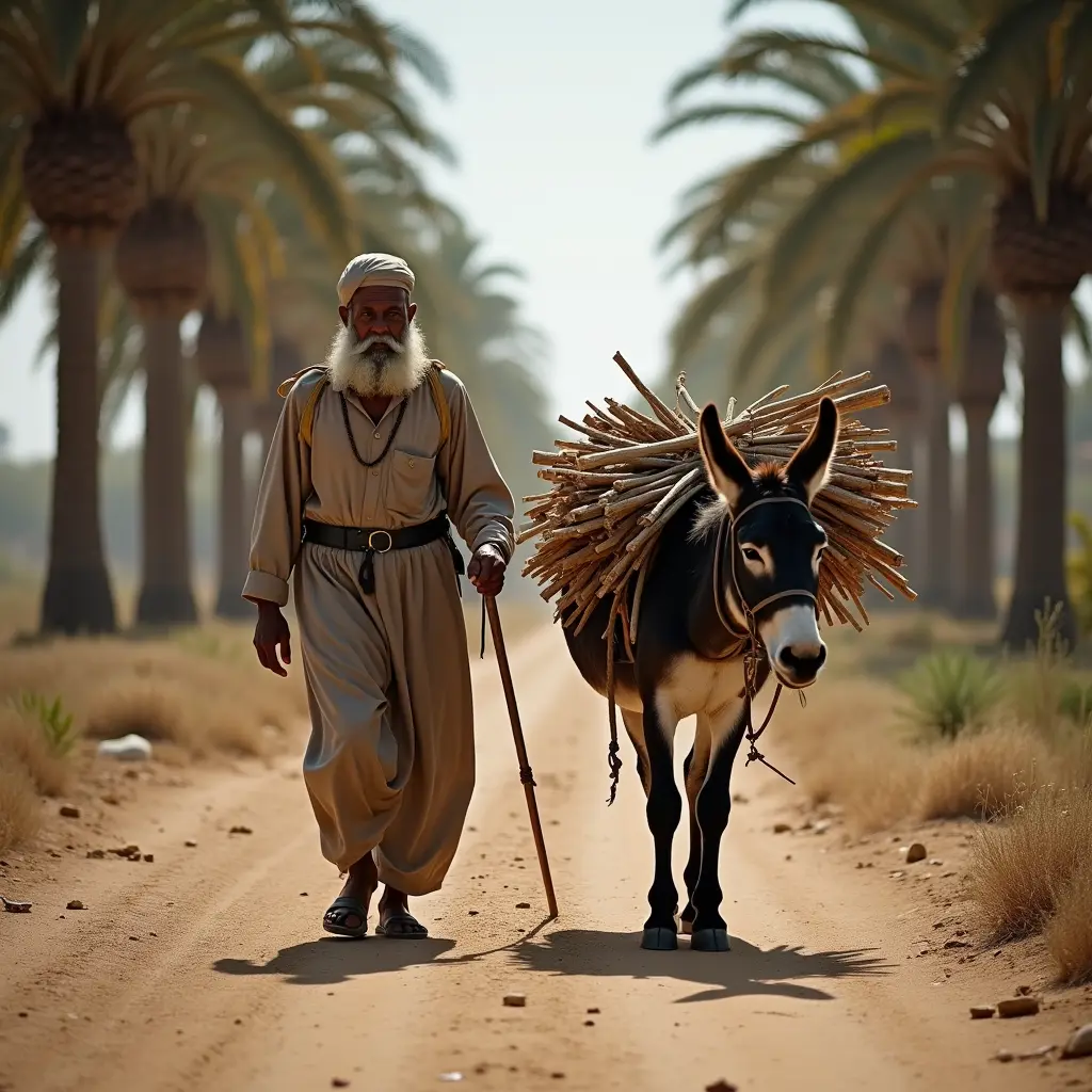 رجل عجوز عراقي  ملتحي وسط نخيل كثيف يقود حمار يحمل الحطب