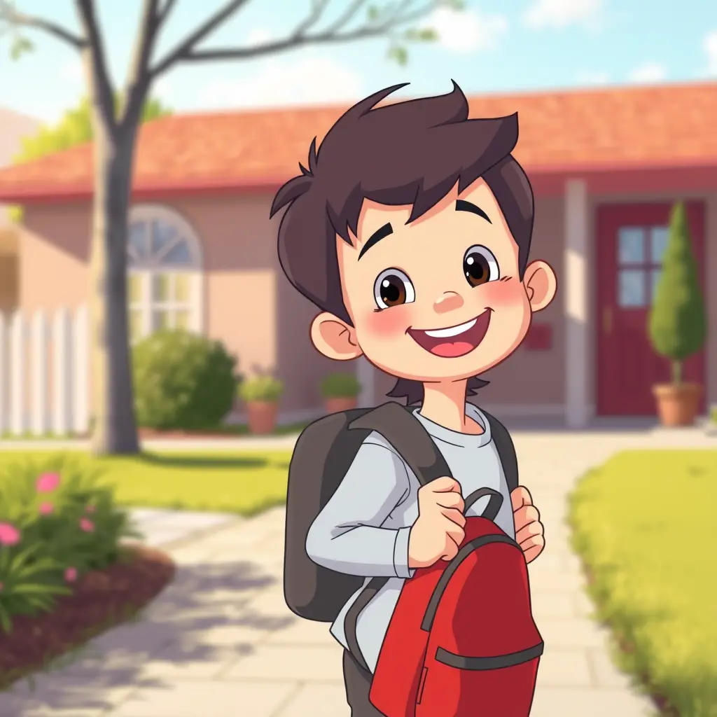 طفل يحمل حقيبة المدرسة وهو سعيد وهو عائد الي المنزل ولكن طفل كرتوني الشكل