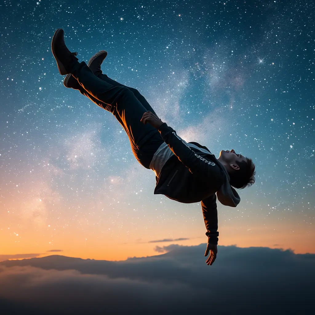شخص يقع من السماء والخلفية تكون جميله و عليها نجوم مضيئه