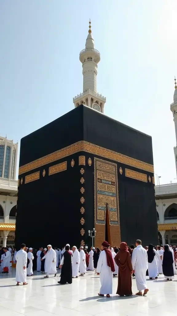 صورة للكعبة يظهر خلفها برج الساعة ومجموعة أشجار