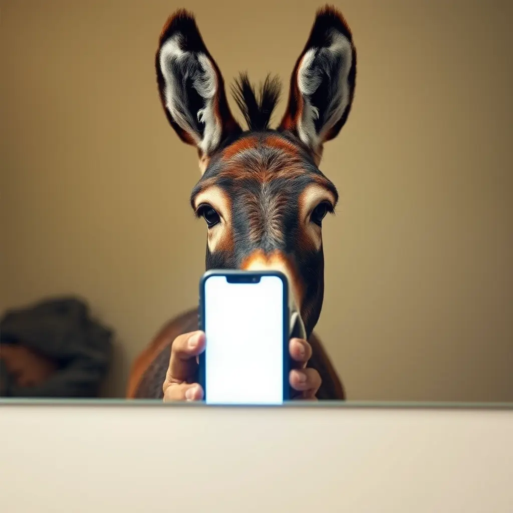 صوره حمار بتصور أمام المرايه وهو ماسك التلفون وماضي ضوء التلفون