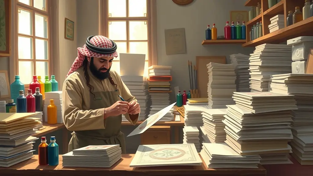 فارس أبو وعد، يرتدي زيًا عربيًا تقليديًا ومئزرًا، يُصمّم بطاقةً بدقة في ورشته. المكان عبارة عن استوديو مريح مليء بأكوام من الورق وزجاجات حبر ملونة وأدوات طباعة. يتسلل ضوء طبيعي ناعم عبر النوافذ، مُلقيًا بتوهج دافئ على مساحة العمل. ينضح المكان بالإبداع والدقة، مُجسّدًا جوهر الحرفية والتصميم. مُقدّم بأسلوب لوحة رقمية مُفصّلة، مع التركيز على التركيز الدقيق والقوام الواقعي.