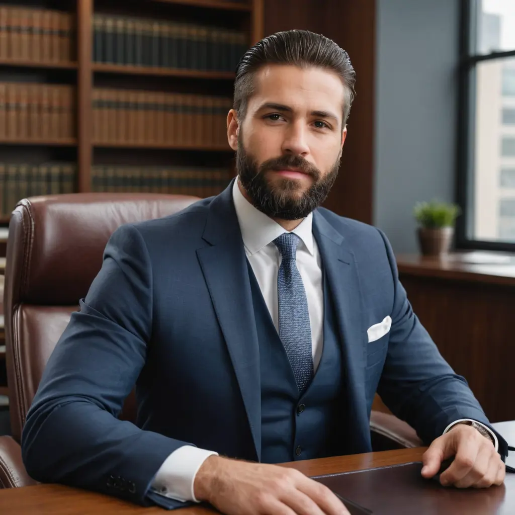 صورة رجل محامي يجلس على مكتب محامة يرتدي بدلة ونضارة ولهو لحيى انيق
