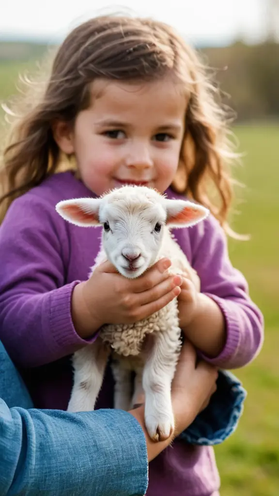 صورة لصغير الخروف أو الحمل بحجم صغير يقف على يد فتاة صغيرة