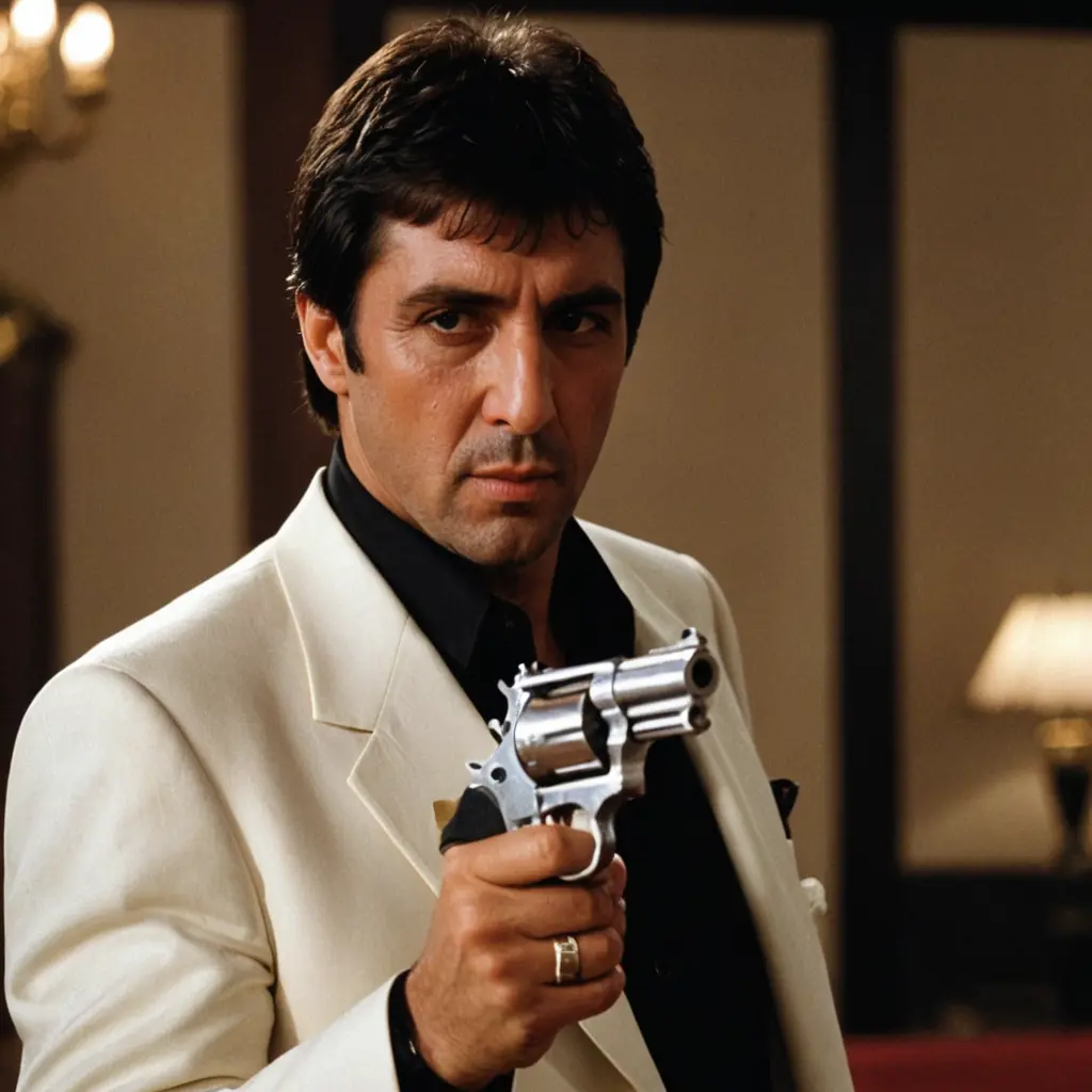 تونى مونتانا من فيلم سكارفيس وهو يمسك مسدس فضى