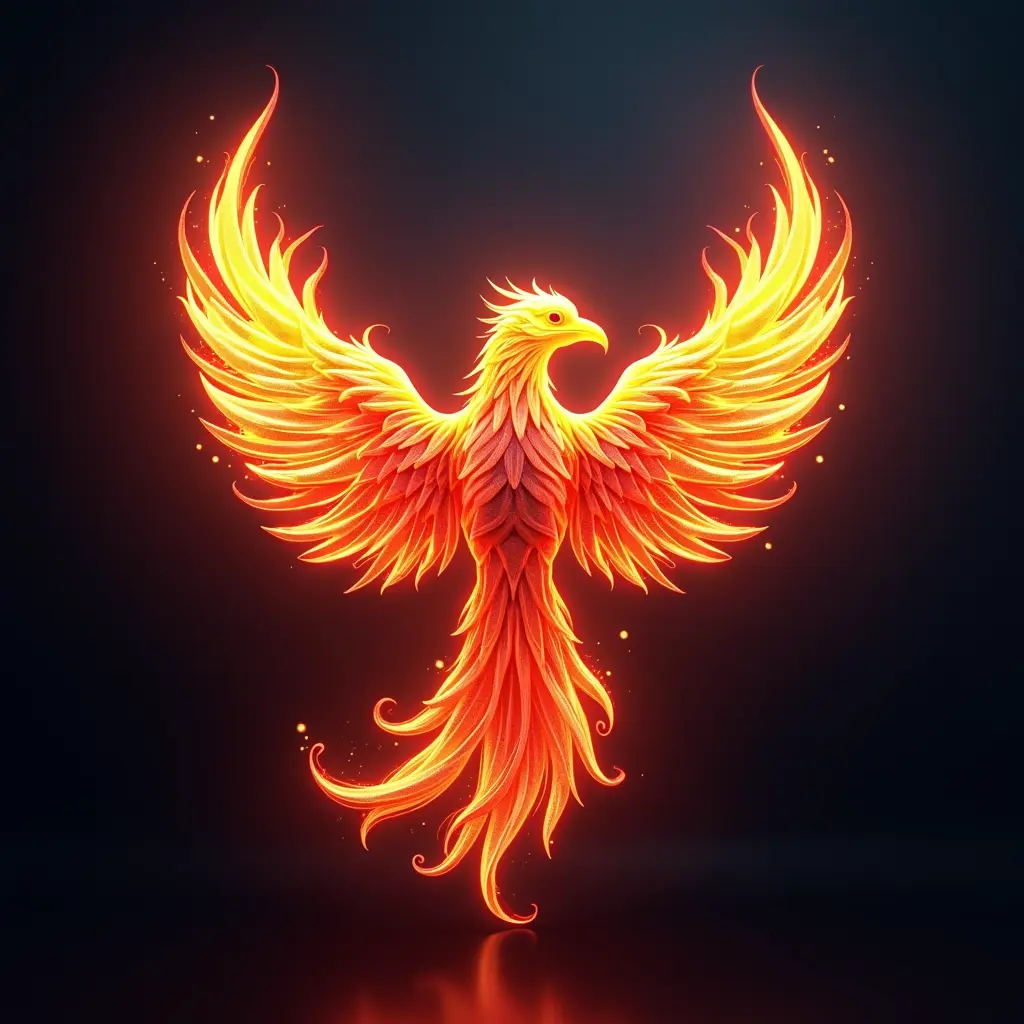 شعار طائر العنقاء يخرج من نيران رقمية، بمظهر مستقبلي وألوان نيون مضيئة، ثلاثي الأبعاد