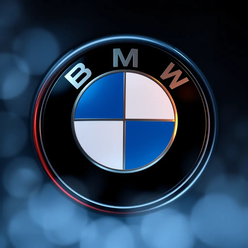 شعار BMW بخلفية سوداء وخلفة ضوء غامض من سيارة BMW 2025