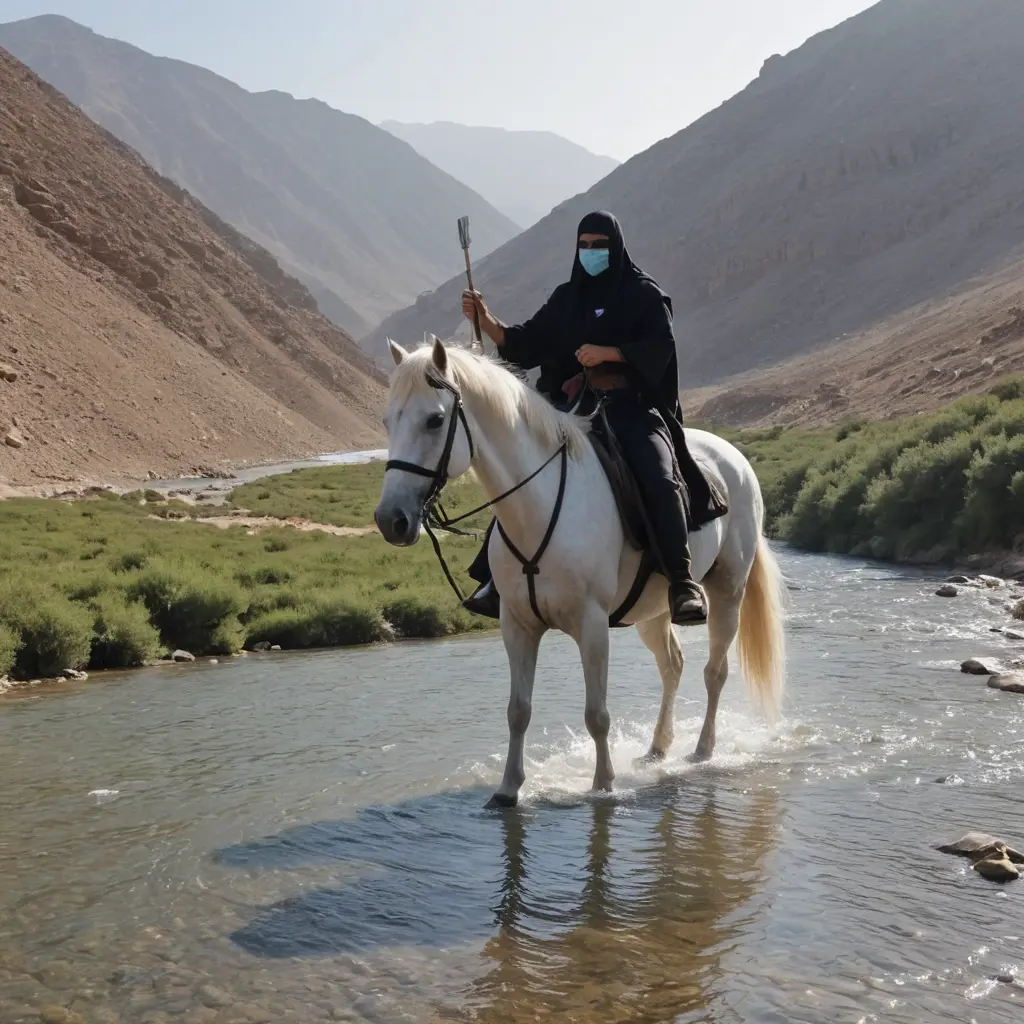 نهر في طويل في جبل عالي عليه حصان عربي لونه ابيض يشرب ماء فوق الحصان شخص ملثم يحمل سيف
