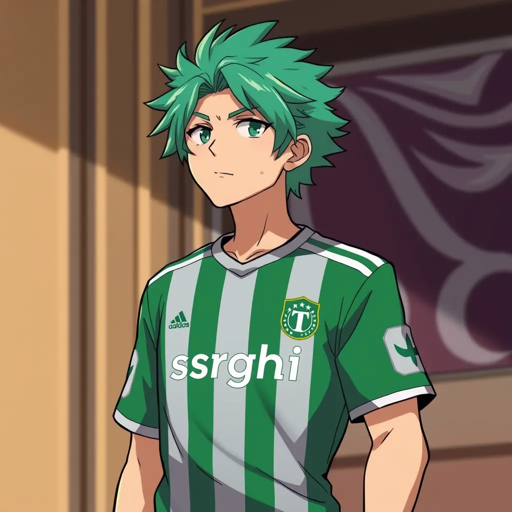 شخصية انمى ترتدى قميص الرجاء البيضاوي ومكتوب فيه ,(srghini)