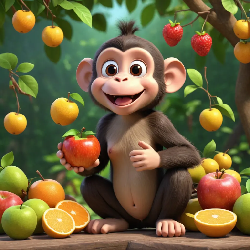 أنثى قرد سعيدة أكلت كل الفواكه كرتون 3d
