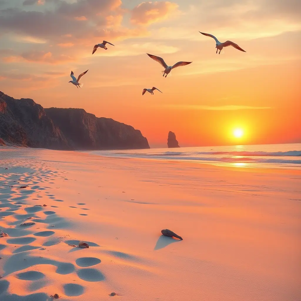 شاطئ ساحلي شاسع عند غروب الشمس، تُلقي أشعة الشمس الذهبية بظلالها الطويلة على الرمال، بينما تُحلّق طيور النورس برشاقة في السماء. الأفق مزيجٌ آسر من درجات اللون البرتقالي والوردي تنعكس على أمواج المحيط الهادئة. تمتد حبيبات الرمال البيضاء الناعمة على طول الشاطئ، مع أصداف متناثرة وخشب عائم يُضفي عليها لمسةً طبيعية. في الخلفية، ترتفع المنحدرات الصخرية بشموخٍ نحو السماء، وتلتقط أسطحها الوعرة آخر خيوط الشمس. صُوّر هذا المشهد بأسلوب لوحة رقمية، مع التركيز على التركيز الدقيق والإضاءة الواقعية لإبراز ألوان غروب الشمس النابضة بالحياة وتحليق طيور النورس الأنيق.