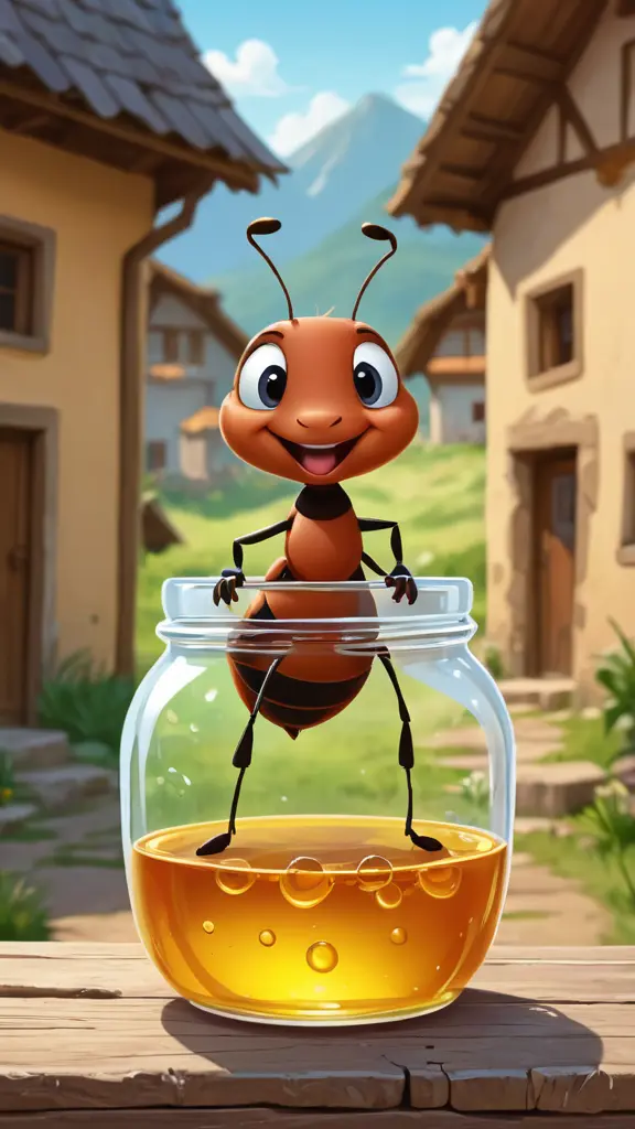 نملة جميلة عند جرة عسل وسط القرية رسم كرتوني