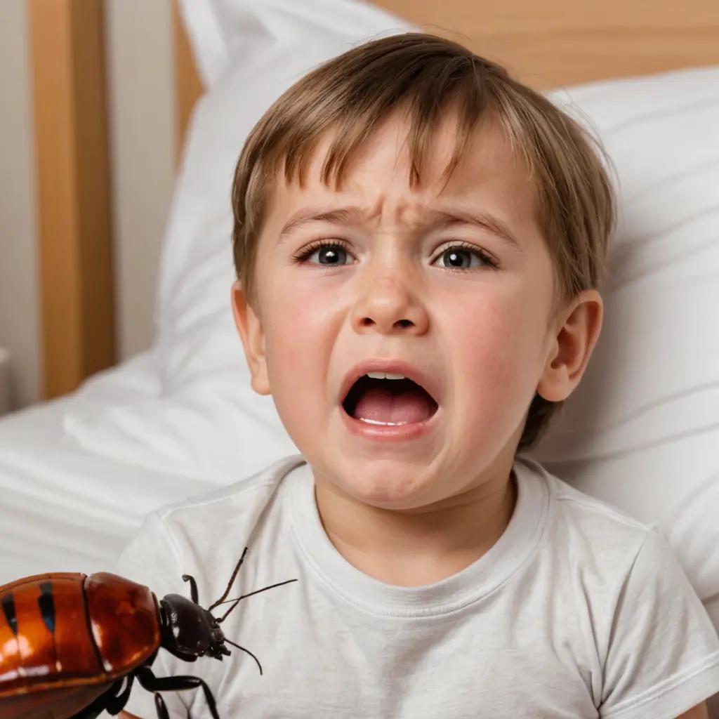 صورة لطفل منزعج ويبكي من لقص بق الفراش لجسمه مع تواجد بق الفراش بالقرب منه وعلى جسمه