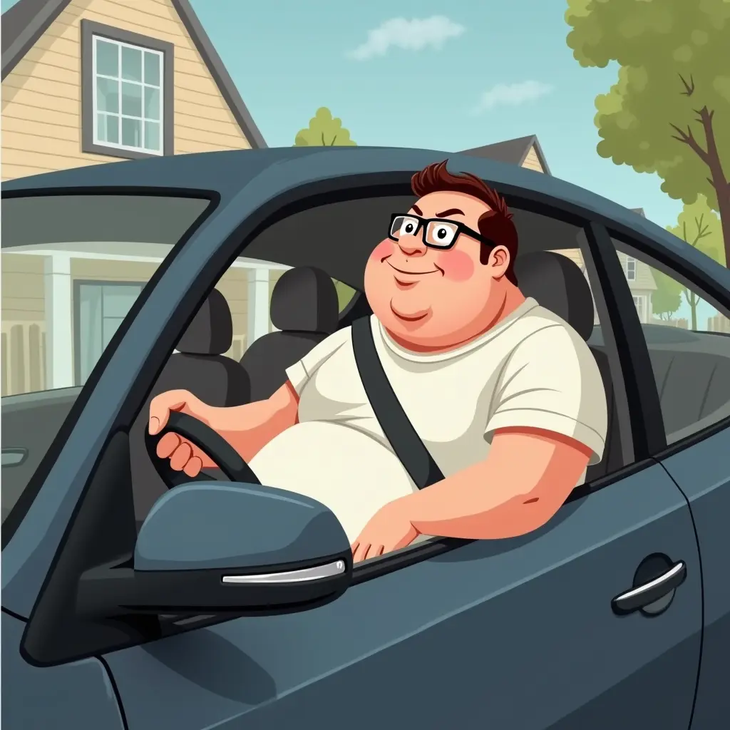 صمم لي صورة شخص متوسط الطول سمين ويرتدي نظارات ويركب سيارة من نوع كيا سيراتو موديل 2013 لون سكني