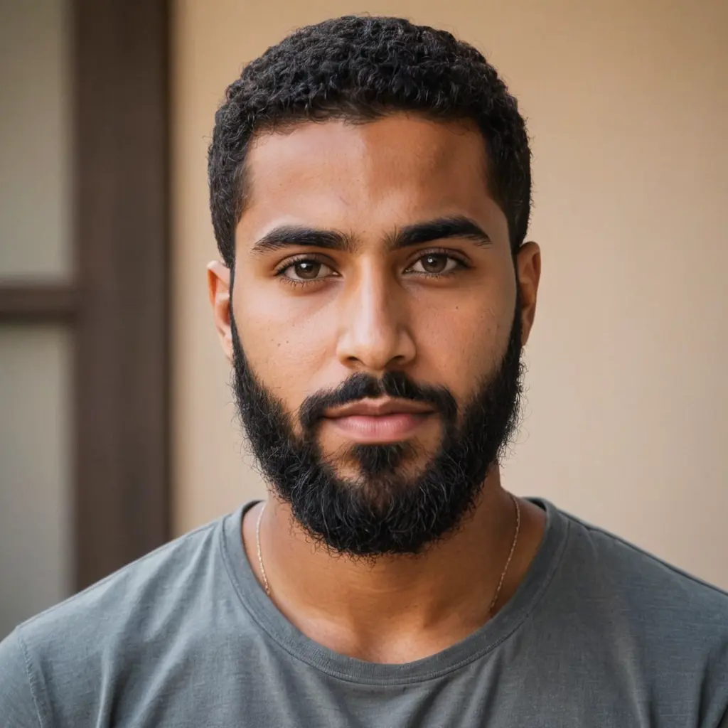 صورة لشاب اسمر ذو لحية كثيفة عيون كبار طويل البنية اسمو خالد