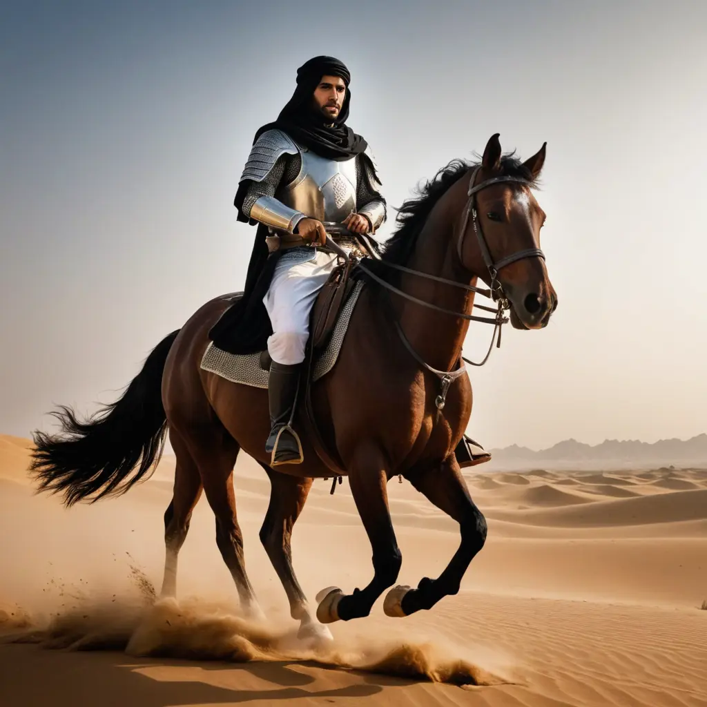 فارس عربي يحمل سيفا يركب خيلا في وسط الصحراء