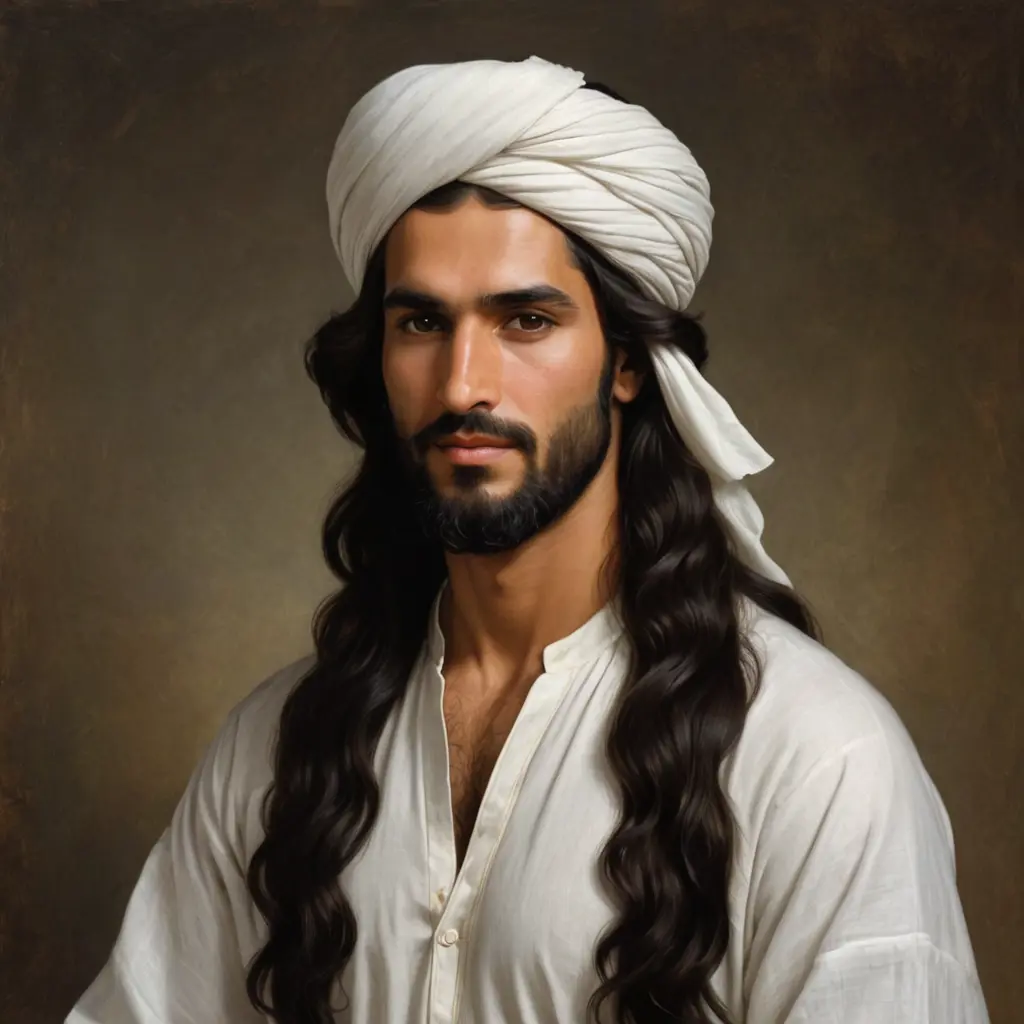 رجل فخم، طويل قليلاً، معتدل الخَلق، متماسك البدن. أزهر اللون، ليس شديد البياض ولا الأسمر. على رأسه عمامة ويرتدي قميص أبيض عربي ضخم الرأس، شعر شديد السواد، متوسط الجعودة، يصل إلى الأذنين أو الكتفين. الذراعان واليدان: طويل الذراعين، كثيف الشعر، كفّان واسعتان، أصابع طويلة. المنكبان والصدر والبطن: واسع المنكبين، كثير الشعر، عريض الصدر، بطن مسطح. المفاصل: كبيرة. الوجه: مستوي، خدان سهلان، بين الاستدارة والإسالة. الجبين: واسع. الحاجبان: مقوّسان متصلان خفيفًا، عرق بينهما يظهر عند الغضب. العينان: سوداء، واسعة، رموش طويلة، تشبه الكحل. الأنف: مستقيم، طويلاً بعض الشيء، أرنبة دقيقة. الفم والأسنان: واسع، أسنان متفرقة. اللحية: كثيفة، عنفقته بارزة. القدمان: ضخمتان، سطحهما كاملًا على الأرض، قليل لحم العقبين.