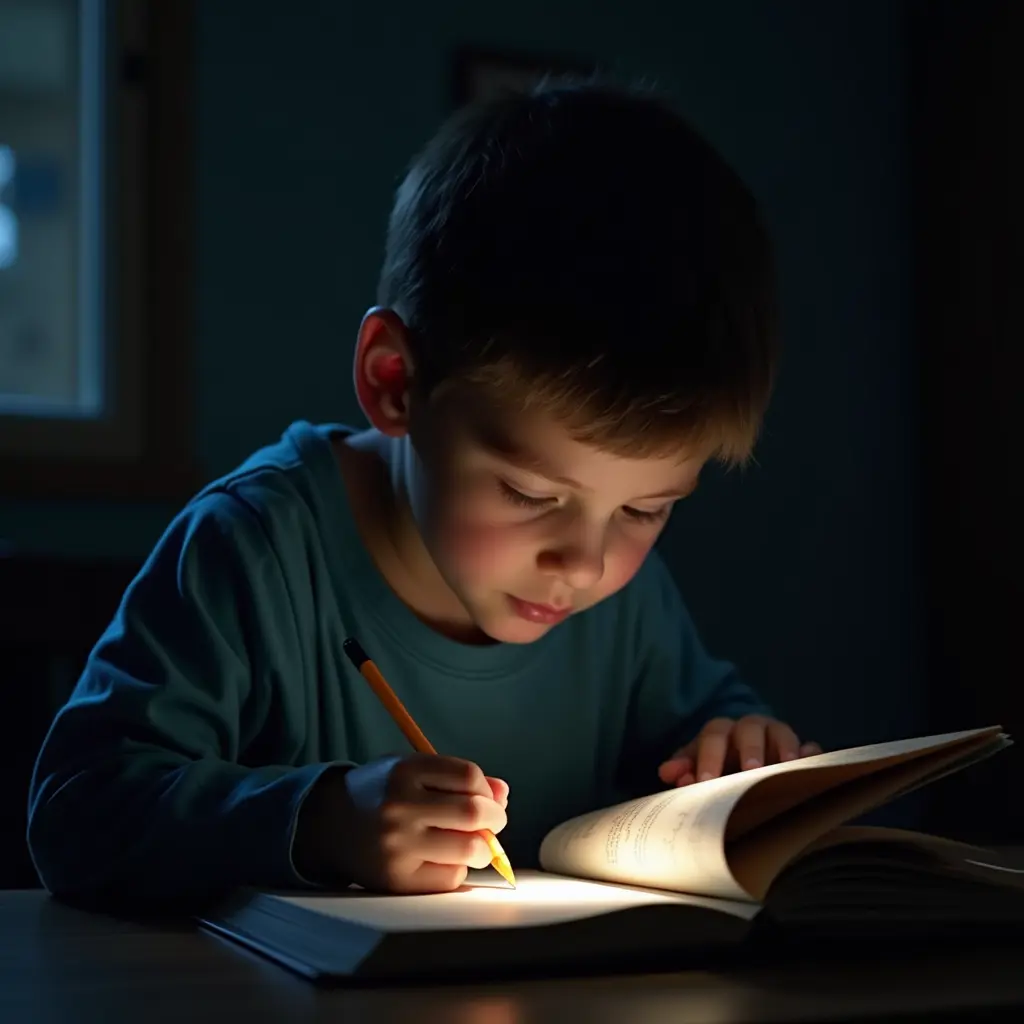 صورة ولد يذاكر مع ضوء خافت