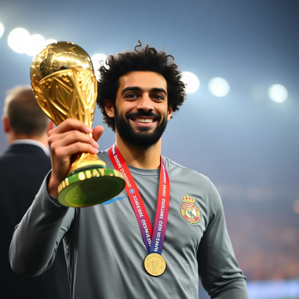 محمد صلاح مع جائزه الكوره الذهبيه بعد فوزه بدوري أبطال أوروبا وكاس العالم