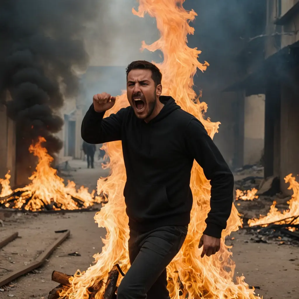 رجل يحترق بالنار و يصرخ و الناس خائفون و النار تلتهم المكان