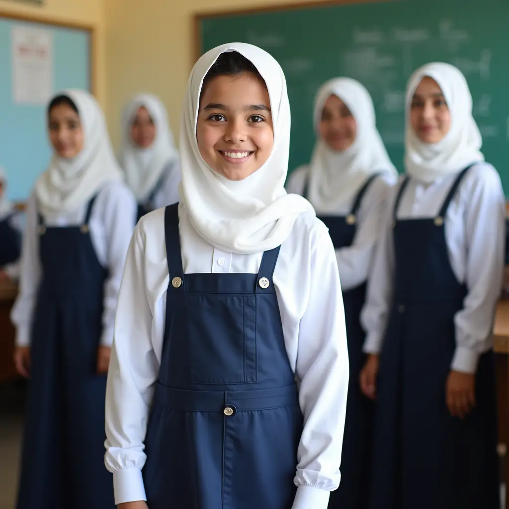 طالبة عمانية بعمر 16 عاما ترتدي الزي المدرسي عبارة عن حجاب أبيض اللون و مريولا كحلي اللون و قميصا أبيضا و تقف في قاعة الصف مع زميلاتها الطالبات العمانيات المحجبات و معلمتهم العمانية المحجبة