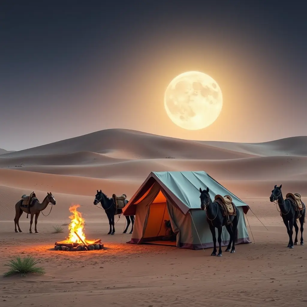 صحراء مع خيمه مع خيل وجمل ونار وداتب عربيه