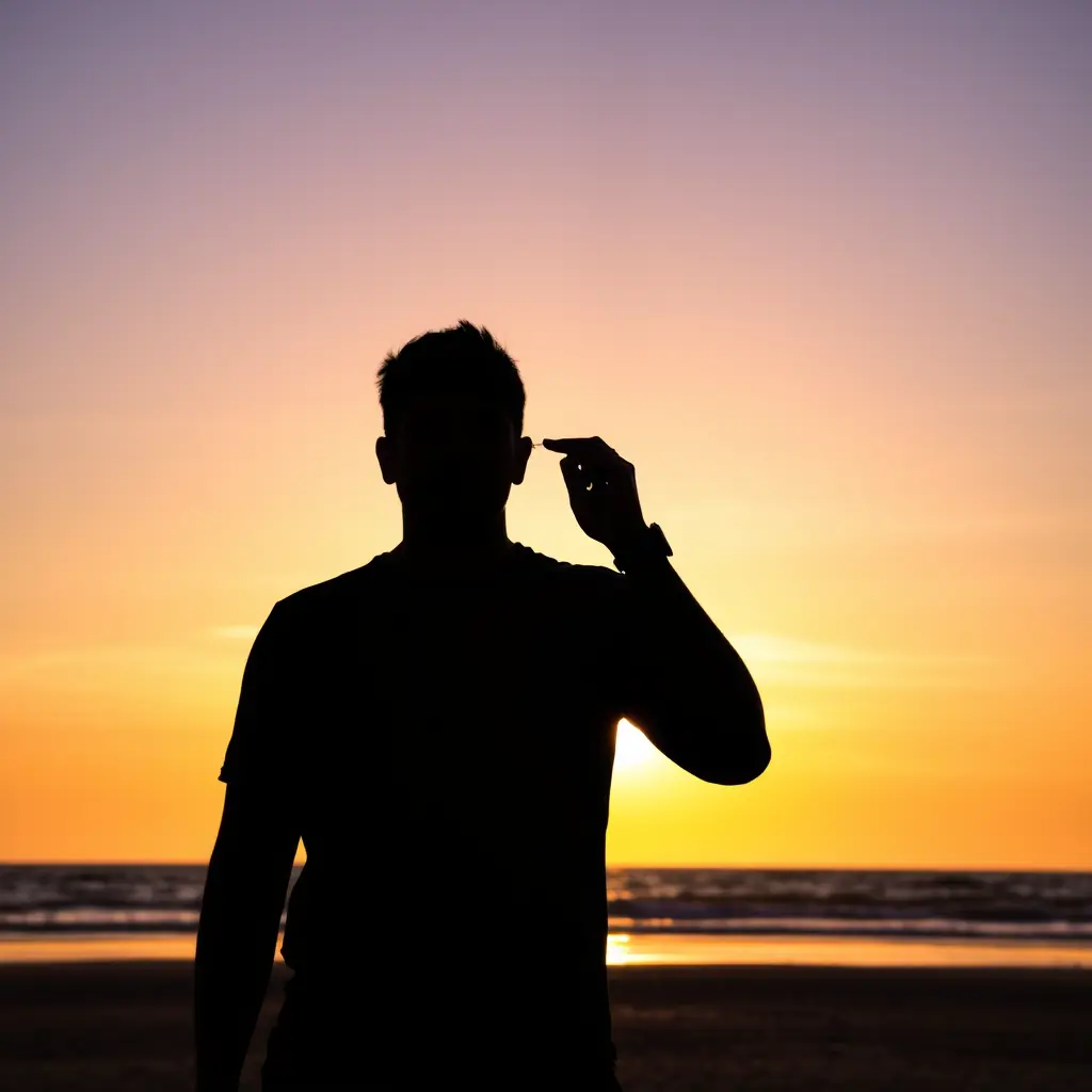 ظل رجل أمام غروب الشمس، سماء خلابة، تصوير بزاوية واسعة، تباين قوي، ألوان برتقالية وأرجوانية زاهية، على الشاطئ