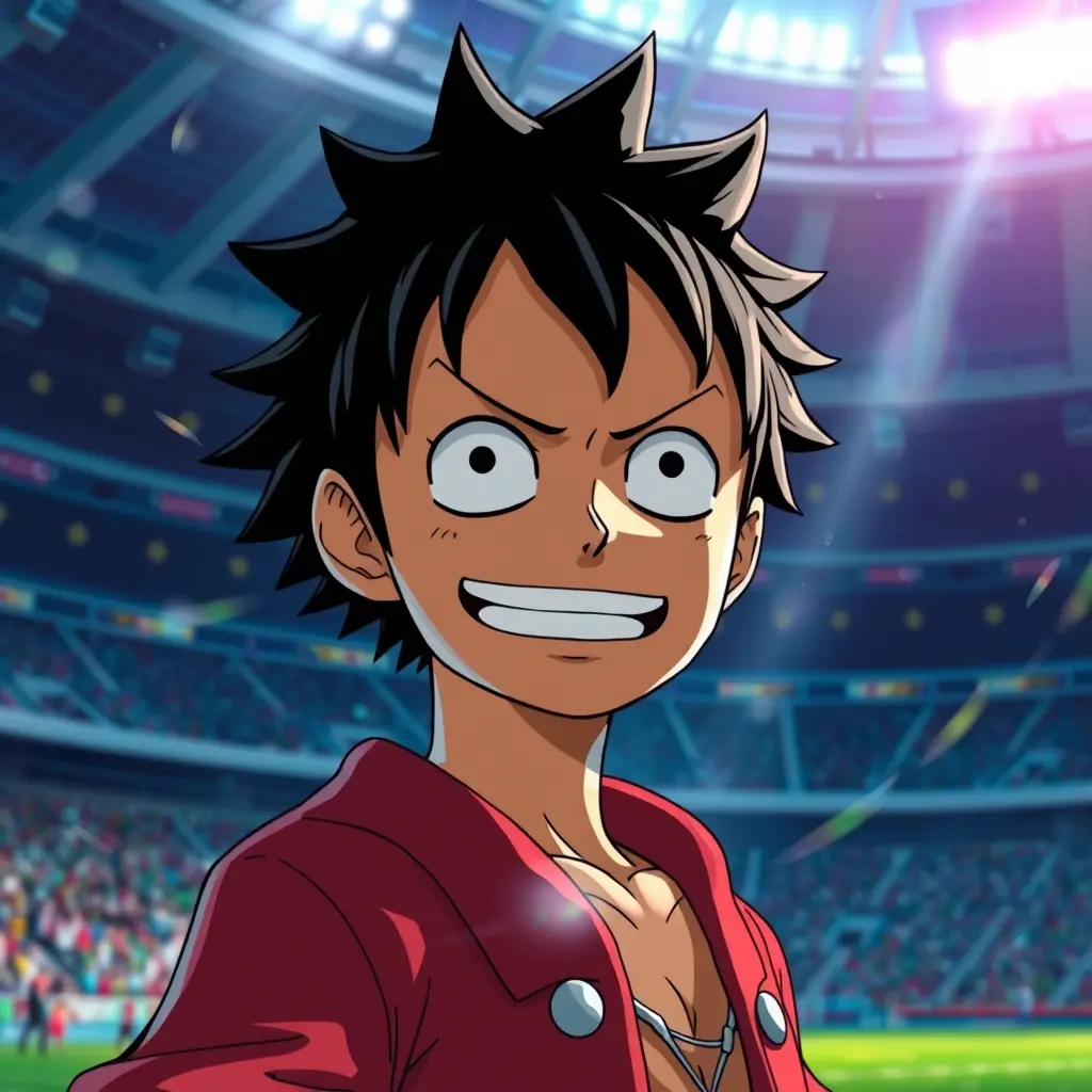 صورة لشخصية لوفي من انمي ون بيس في ملعب كرة القدم و موثرات مثيرة بدقة 4k