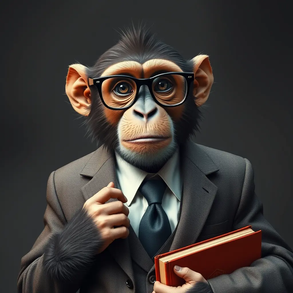 قرد يرتدي بدله ويضع نظاره ويحمل الكتاب
