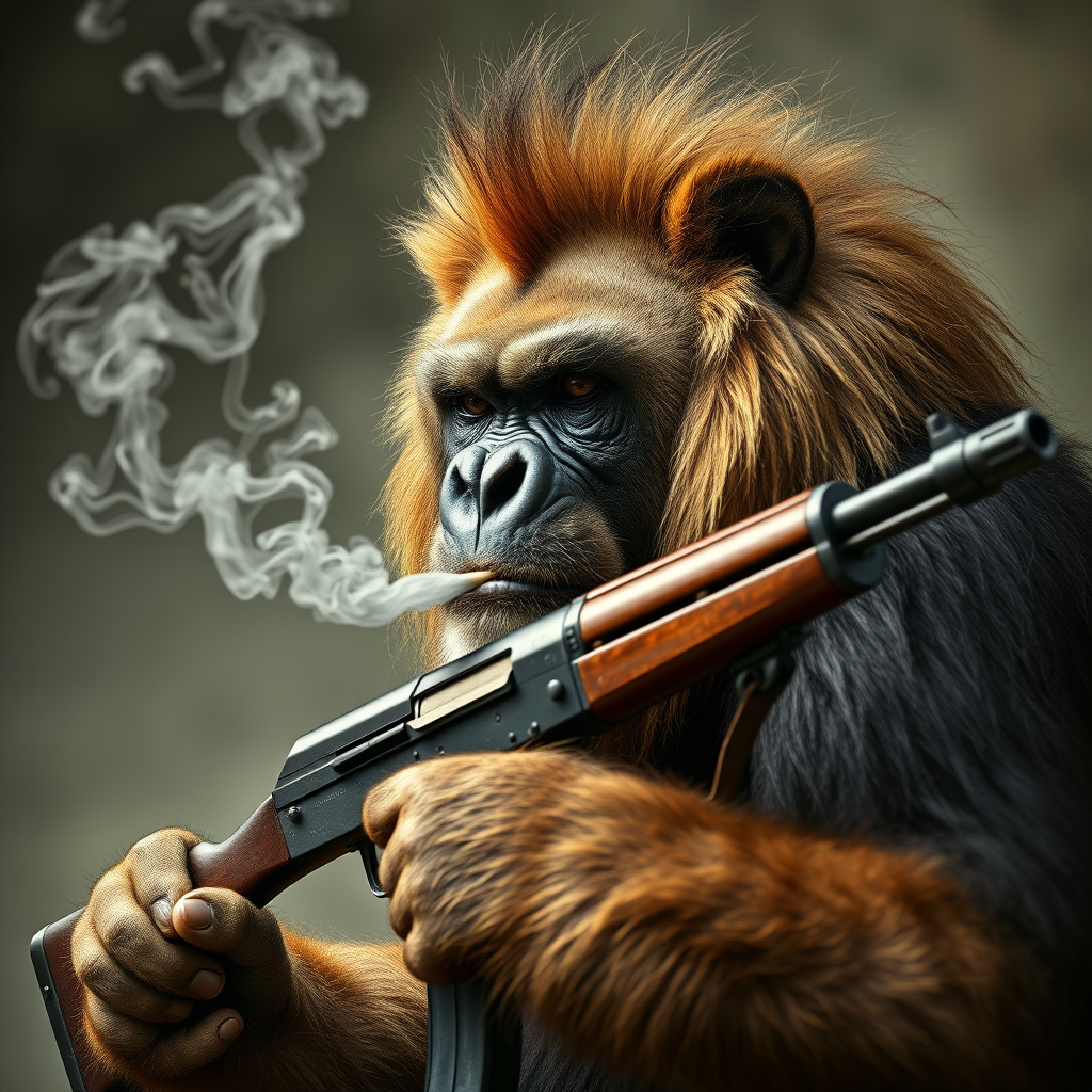 غوريلا برأس اسد تحمل سلاح اك 47 و تدخن الحشيش