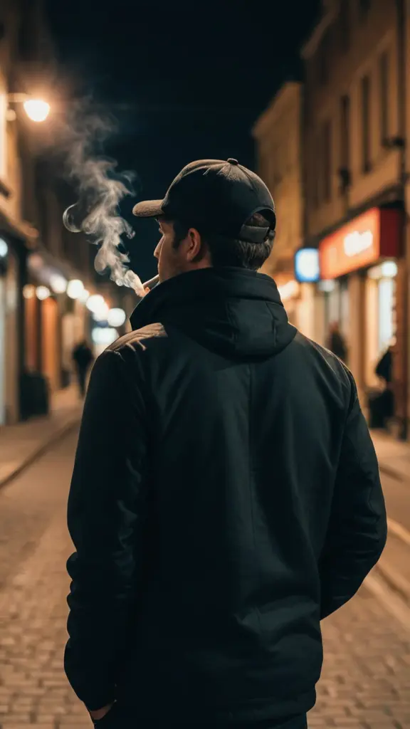 رجل من الخلف يرتدي كاب و يدخن و يشرب قهوة في الشارع في الليل