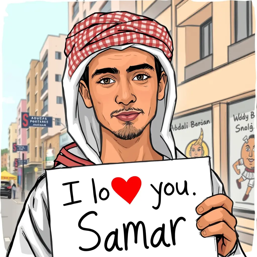 ارسم لي شاب اردني حنطي اللون لابس ثوب وشماغ حامل لافته مكتوب عليها احبج سمر في منطة البوليفارد العبدلي