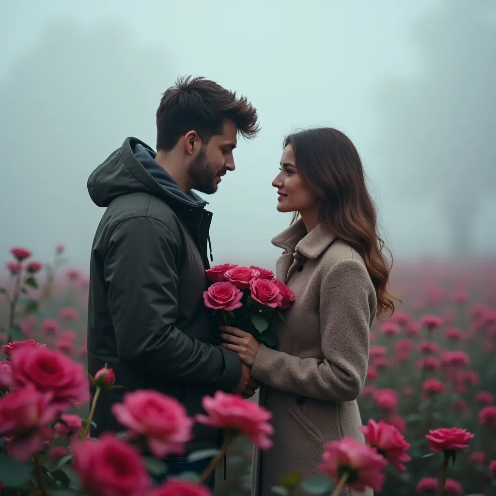 شخص يعطي ورد لحبيبته ، في مكان هادئ وضبابي ، وحوله الكثير من الازهار الوردية وامامه حبيبته في ردة فعل خجولة