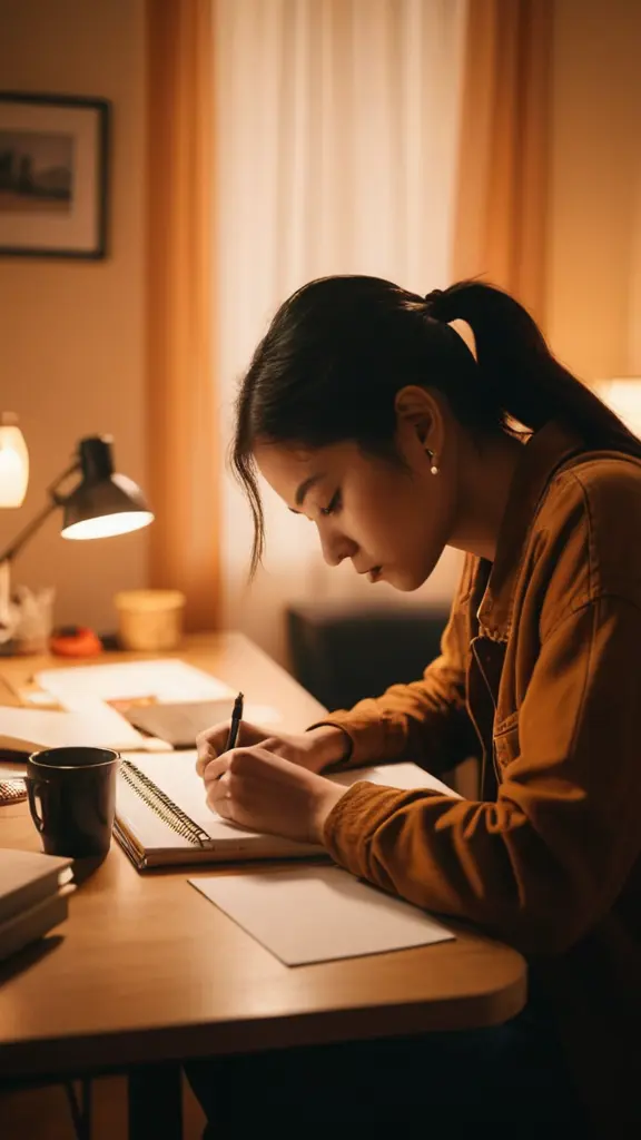 شخص يجلس على مكتب، يكتب في دفتر ملاحظات، محاط بألوان دافئة وأضواء هادئة. تركز الكاميرا على يده وهي تكتب. - **المشاعر:** هدوء وتركيز.