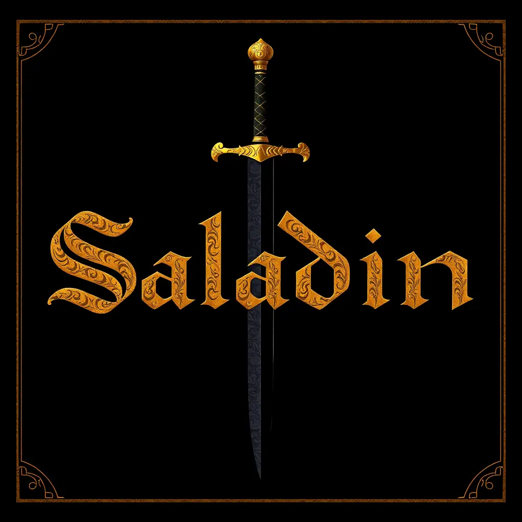 اسم صلاح الدين بأجمل خط عربي باللون الذهبي مع سيف دمشقي وخلفية سوداء داكنة