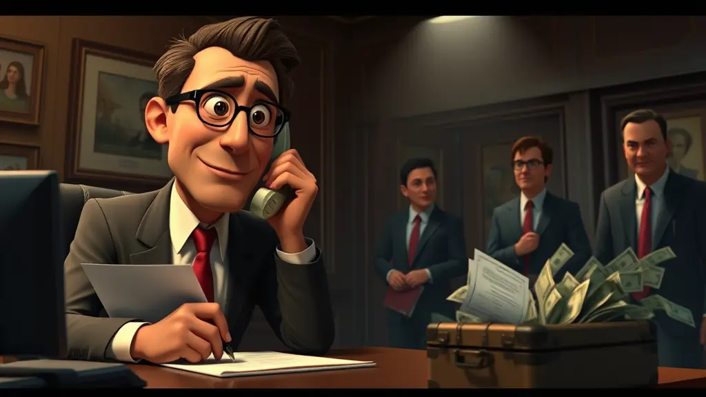 "Ysef em um escritório esfumaçado, falando ao telefone com expressão confiante, Estilo 3D Pixar. A câmera gira para mostrar documentos sendo assinados por J. Mine e Ricard, enquanto malas de dinheiro são carregadas por homens de terno, na animação 3D da Pixar."
