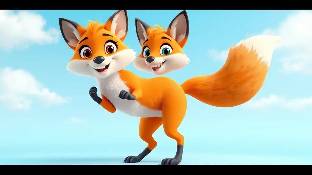A full-body 3D cartoon fox character standing cheerfully in a bright, playful setting. The fox has vibrant orange fur, a white fluffy chest and cheeks, large shiny eyes with long lashes, and dark-tipped ears. It has a rounded face, expressive eyebrows, a small black nose, and an open smiling mouth showing tiny teeth. Its front paws are raised in excitement, and its big bushy tail curves joyfully behind it. The fox stands on two legs in a lively pose, giving off a happy and energetic vibe. The background is a clear blue sky with soft clouds. No humans or realistic textures — cartoon style only.