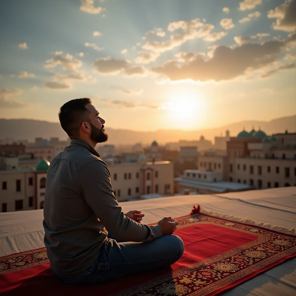 رجل ينظر للسماء وهو جالس علي سجادة الصلاة يدعو الله وتحته كلمه altawbah