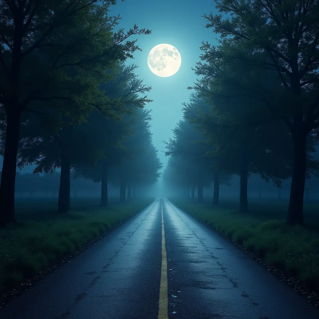 مرحبًا، اريدك أن تصمم لي غلاف كتاب احترافي، يكون هذا الغلاف يعبر، عن طريق في المنتصف وعلى جانبيه اشجار، ويوجد قمر على آخر هذا الطريق، مع مراعاة قياس الغلاف، وضعها لي على غلاف كتاب.