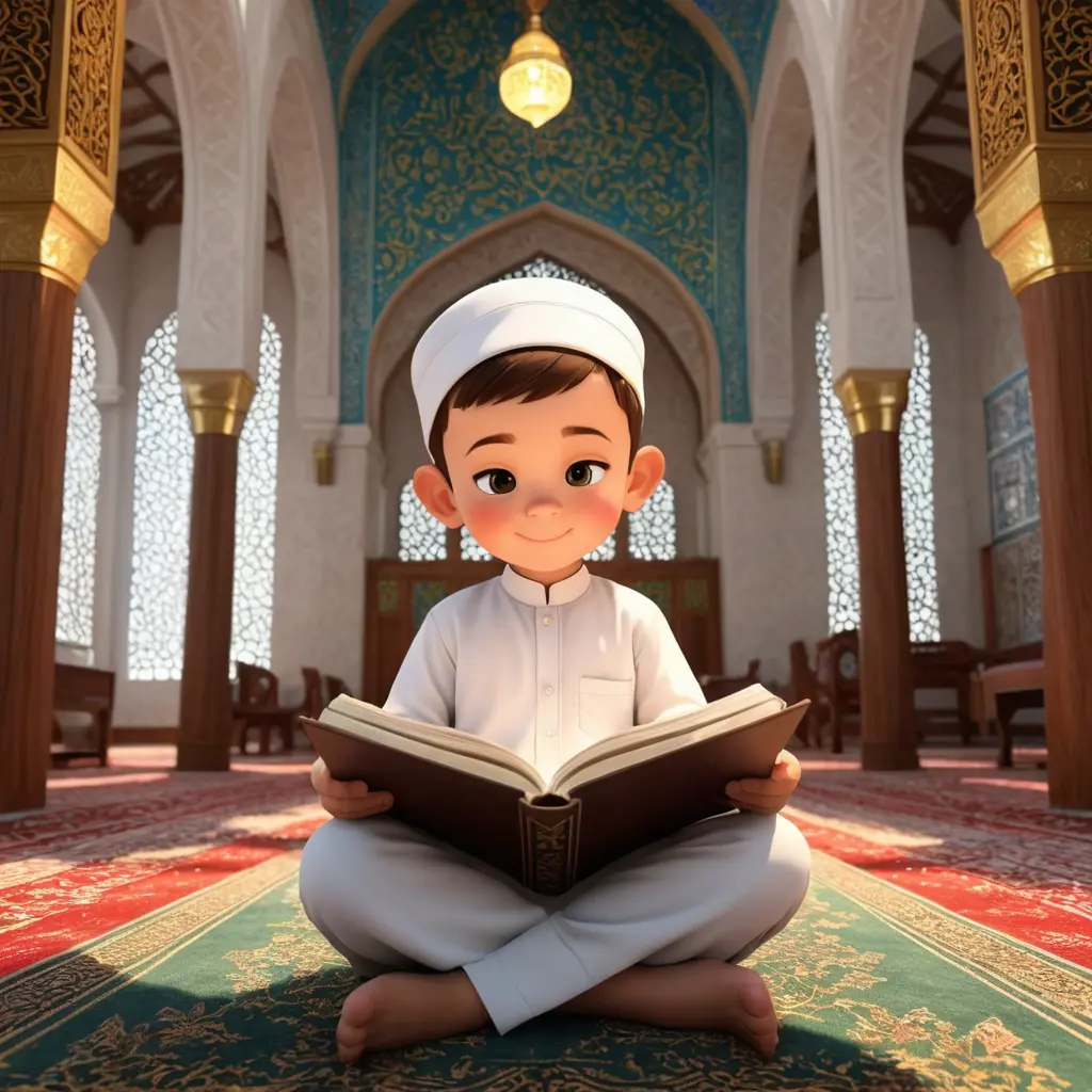طفل كرتوني يقرأ القرآن الكريم في المسجد والمسجد جميل مزخرف زخرفة اسلامية