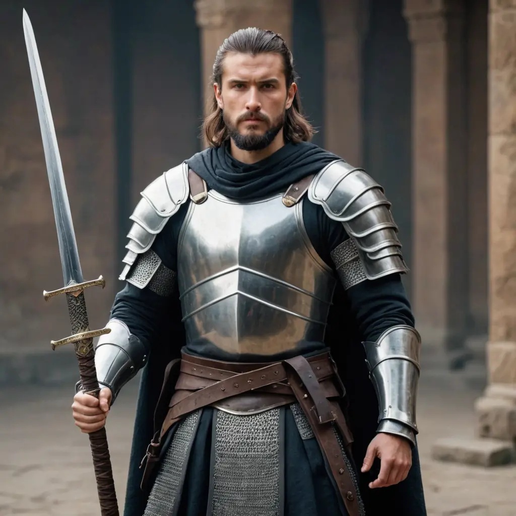 صورة محارب يحمل سيف دو شعر قصير مسرح للخلف وجميل ووسيم وطويل وعريض تكفين ودو فك ولديه شعر كول فمه ودقنة وعمره 27 يرتدي درع خفيف