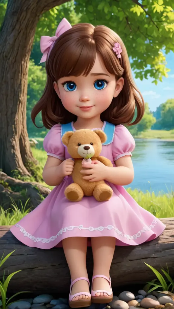 شخصية كرتونية طفلة صغيرة شعرها بني وعيون زرقاء ترتدي فستان زهري اللون  تحمل لعبة دبدوب صغيرة وتجلس تحت شجرة بجانب ضفة نهر كرتون 4d
