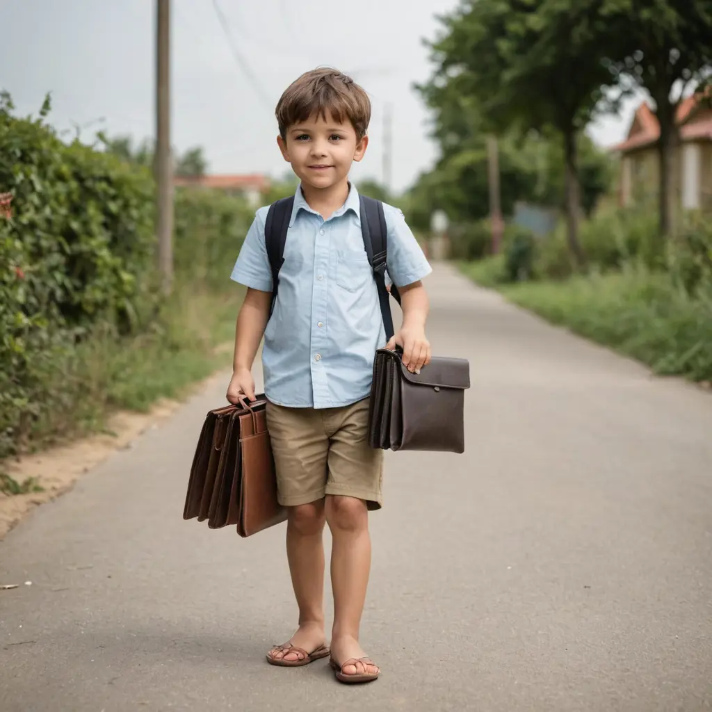 صورة طفل صغير يخمل محفظة كبيرة ، يتوجه إلى المدرسة على قدميه الحافيتين بصعوبة