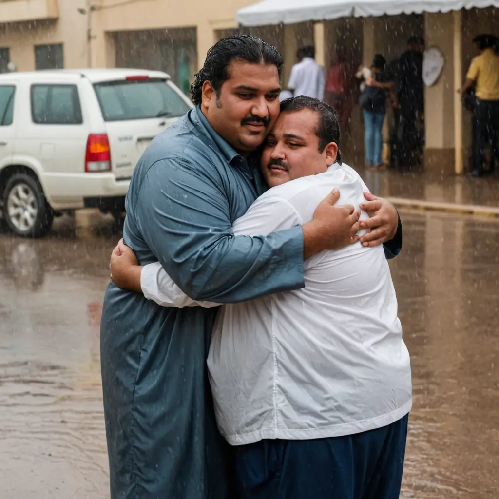 رجل سعودي خمسيني سمين يحضن ولد تحت المطر
