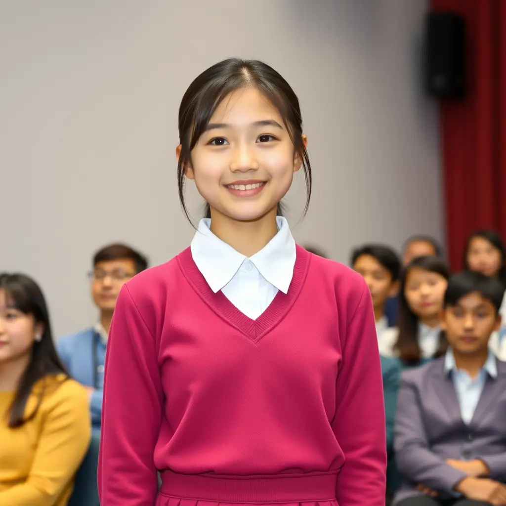 صورة طالبة مدرسة الثانوية مرتبة الشعر تلبس ملابس مدرسية بلون الوردي غامق وقميص أبيض مبتسمة وجميلة وتقف لوحدها أمام الجمهور وخلفها جدار ابيض