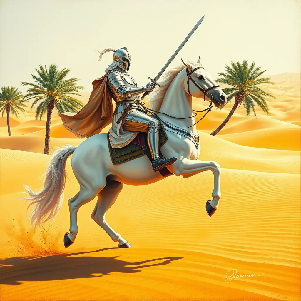 فارس عربي مهيب، يرتدي درعًا فضيًا لامعًا، يمتطي جوادًا أبيض نقيًا، قافزًا، رافعًا قائمتيه الأماميتين في الهواء برشاقةٍ قوية. يتدلى سيف الفارس الطويل إلى جانبه، عاكسًا ضوء الشمس الساطع. يقف بثباتٍ وسط صحراء عربية مترامية الأطراف، تمتد كثبانها الرملية الذهبية على مدّ البصر، وتشبه أمواجها المتموجة بحرًا من الذهب في وضح النهار. تُزيّن أشجار النخيل المشهد، وتُضفي سعفها الخضراء اليانعة نقشًا بارزًا على امتداد الرمال والسماء الشاسعة. رُسم المشهد بأسلوب لوحة زيتية مُفصّلة، بنسيج غني وألوان نابضة بالحياة تُحيي المملكة القديمة.