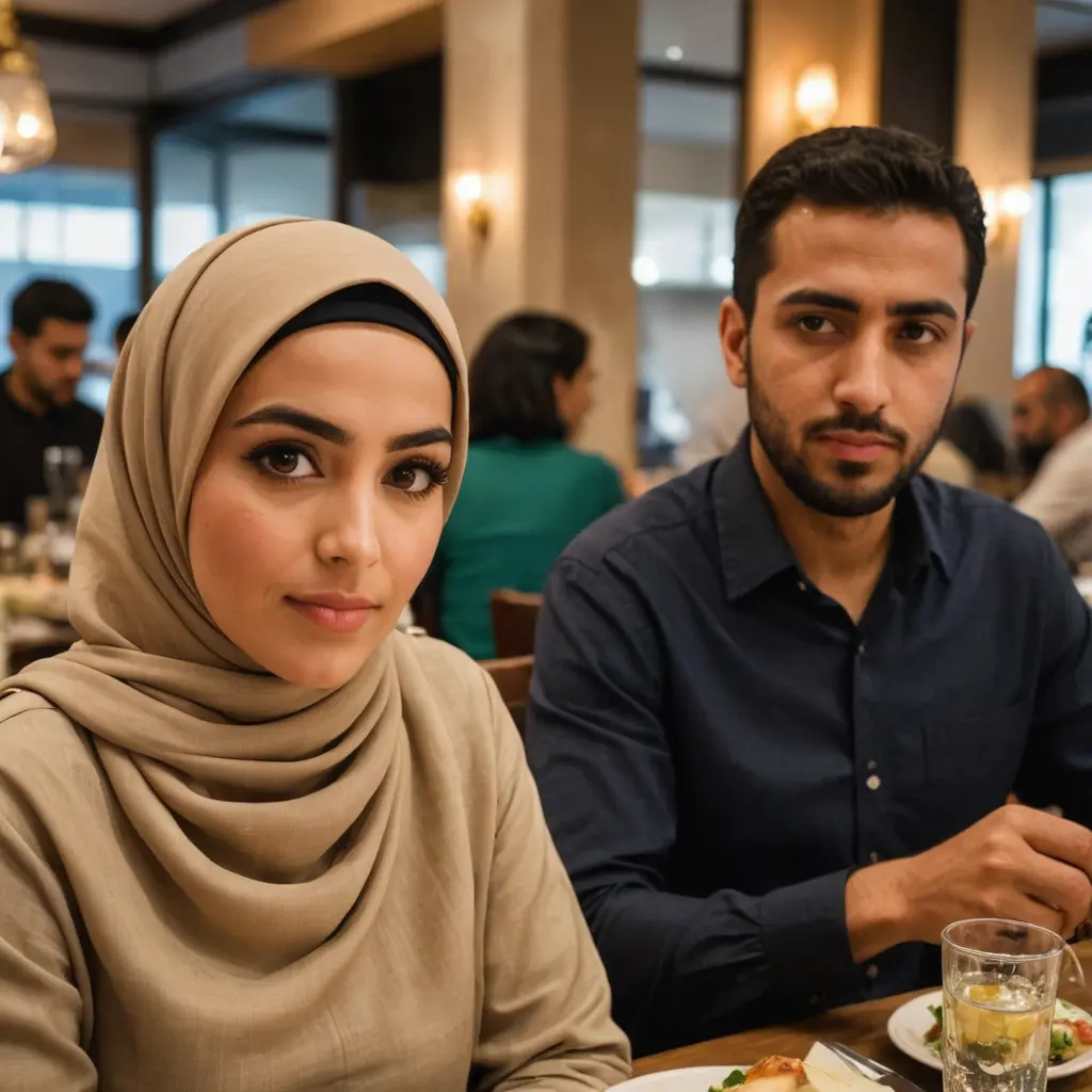 امراه قمحية اللون وعيونها الواسعتان وبحجابها تجلس مع زوجها الاسمر ذو العيون الصغيرة في مطعم اسمه انا قلبي داليلي.