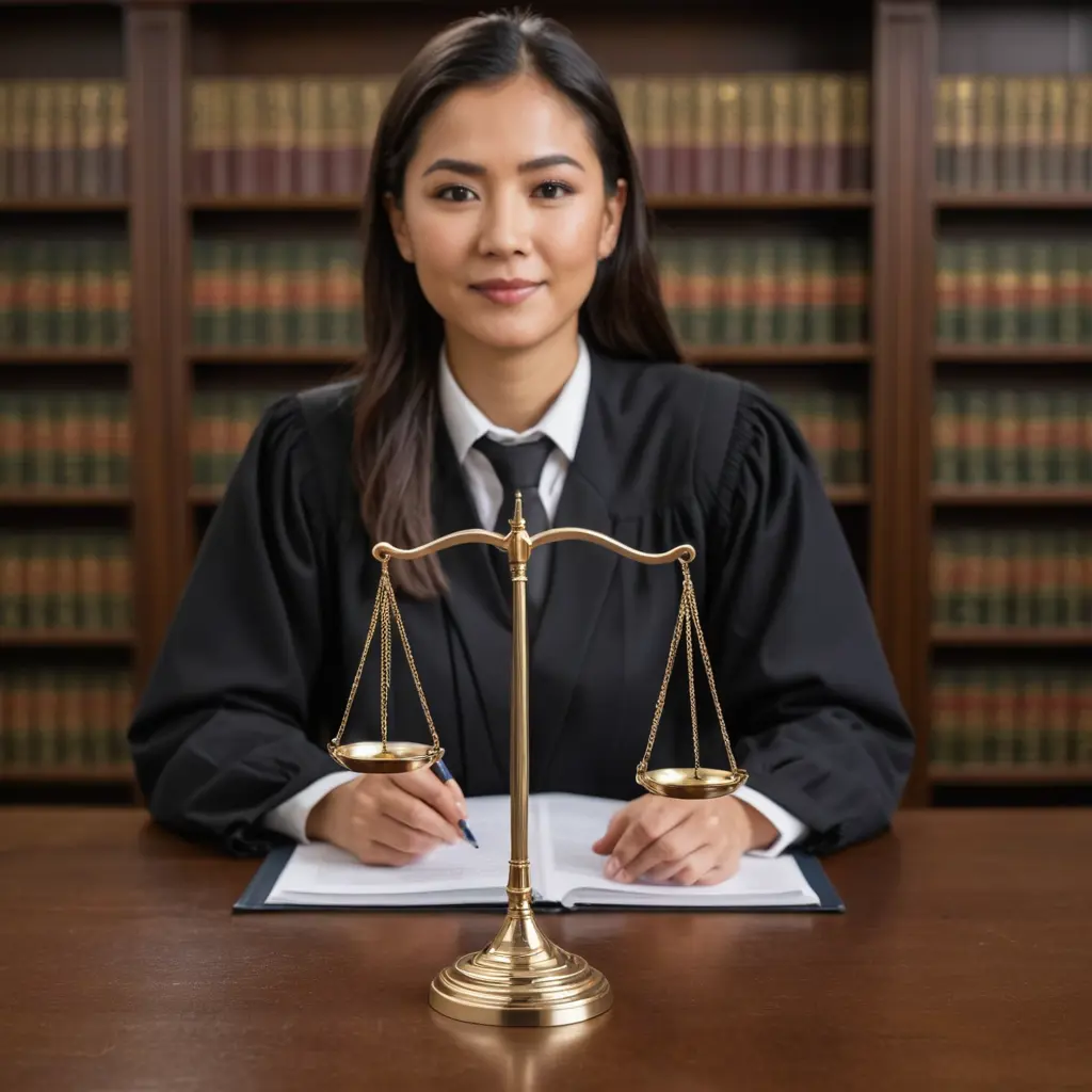 صورة محامي مع ميزان العدالة وخلفية محكمة