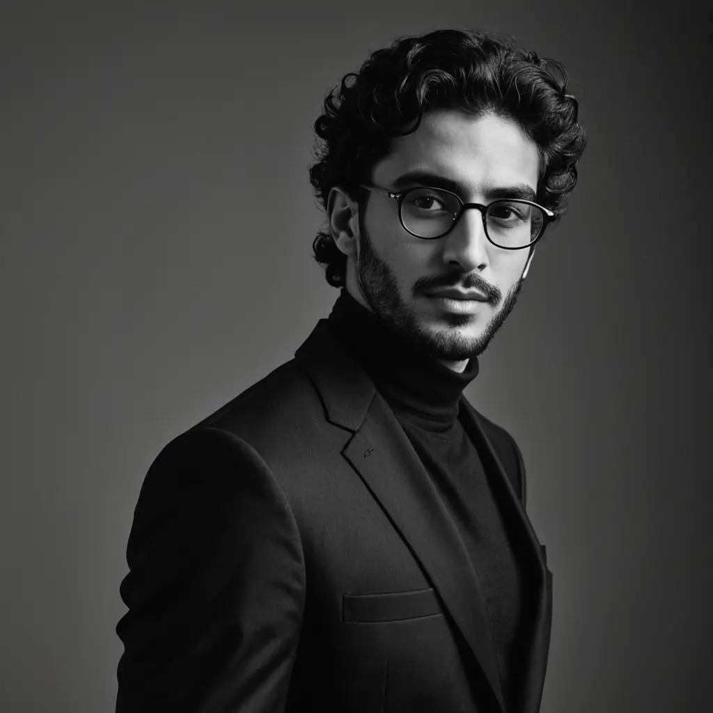 🔖 Prompt (English): A black and white portrait of a sophisticated Middle Eastern man wearing round glasses and a black turtleneck under a tailored black suit. He has short, well-groomed curly hair and a trimmed beard. The background is plain and softly lit, giving a classic studio photography feel. The man looks directly into the camera with a confident and calm expression. High contrast lighting, cinematic black-and-white tones, fashion editorial style