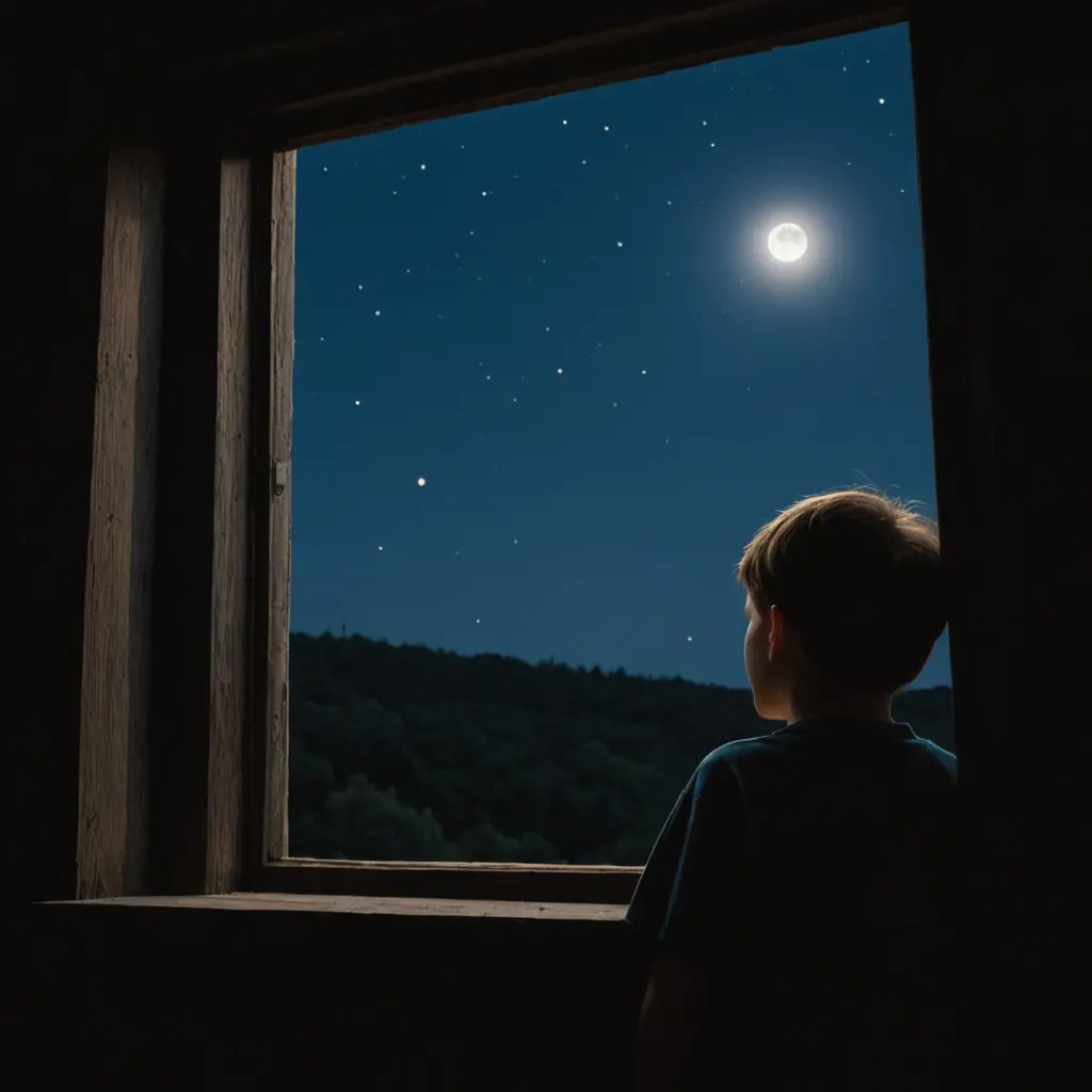 صوره ولد شاب كبير ينظر من الشباك الى السماء والنجوم والقمر في الظلام